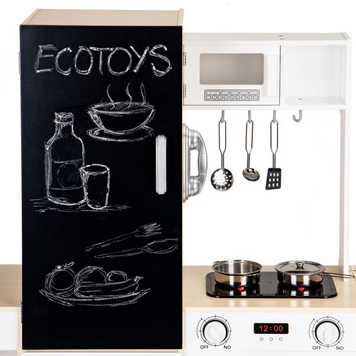 Kuchnia została wyposażona w podświetlane palniki LED oraz efekty dźwiękowe imitujące gotowanie wody, co sprawia, że zabawa staje się jeszcze bardziej realistyczna. Dziecko może korzystać z piekarnika, mikrofalówki oraz dużego zlewu do „mycia” naczyń po skończonym gotowaniu.